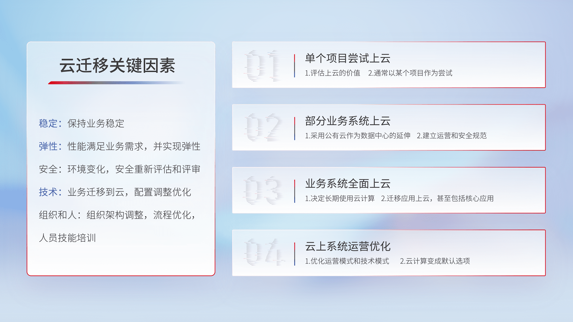 结合实际业务,,从规划设计、、、、云平台选型、、、云原生改造、、、数据迁移、、、、集成交付,,,,迁移全过程为客户识别最佳上云路径,,做好风险识别管理,,设计网络架构、、身份权限、、安全审计合规、、、、操作审计、、、、日志审计、、监控告警策略、、、、多站点容灾设计等,,对云上基础设施进行整体规划,,提升IT治理水平,,,以满足弹性、、、高可用、、高性能的需求。。。