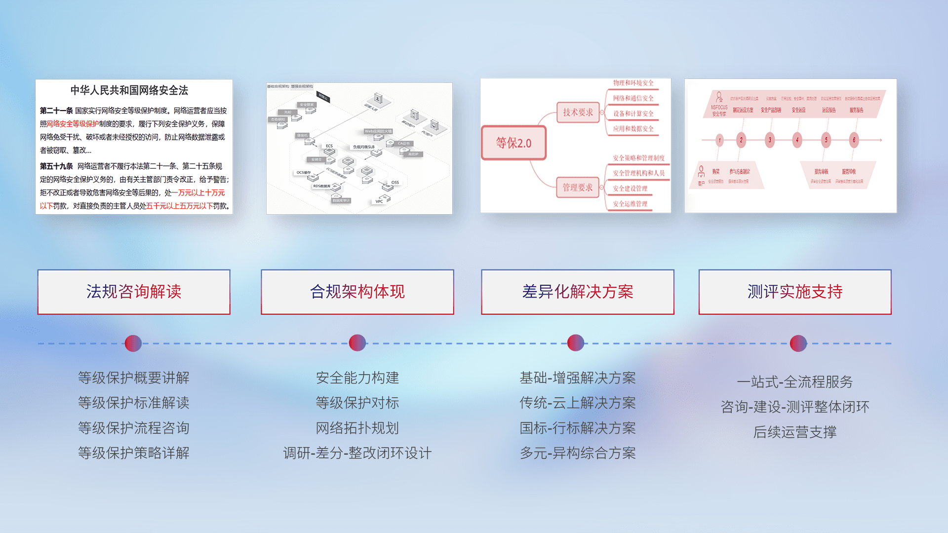 通过专业的法律咨询解读、、、合规架构体现、、差异化解决方案、、测试实施支持等服务,,,,为客户量身打造等保合规体系。。。。